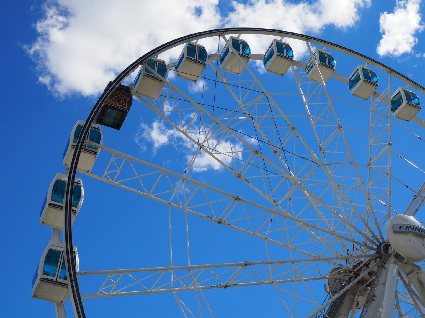 Siellä sitä keikuimme yläilmoissa ja ihailimme kesäistä kaupunkia alapuolellamme. Minä sen, mitä peloltani kykenin katselemaan. Alaspäin tullessa tunne hieman helpotti ja kykenin jopa nauttimaan maisemista. SkyWheel pyöri kolme kertaa ympäri ja takaisin ”lähtölaiturille” saavuttaessa minulla oli jo voittajafiilis. Uskalsin!