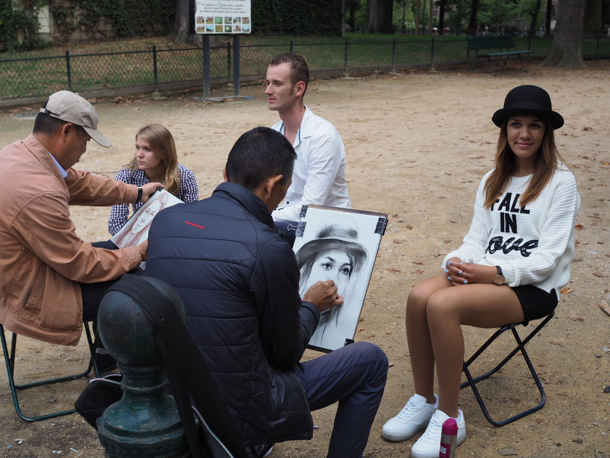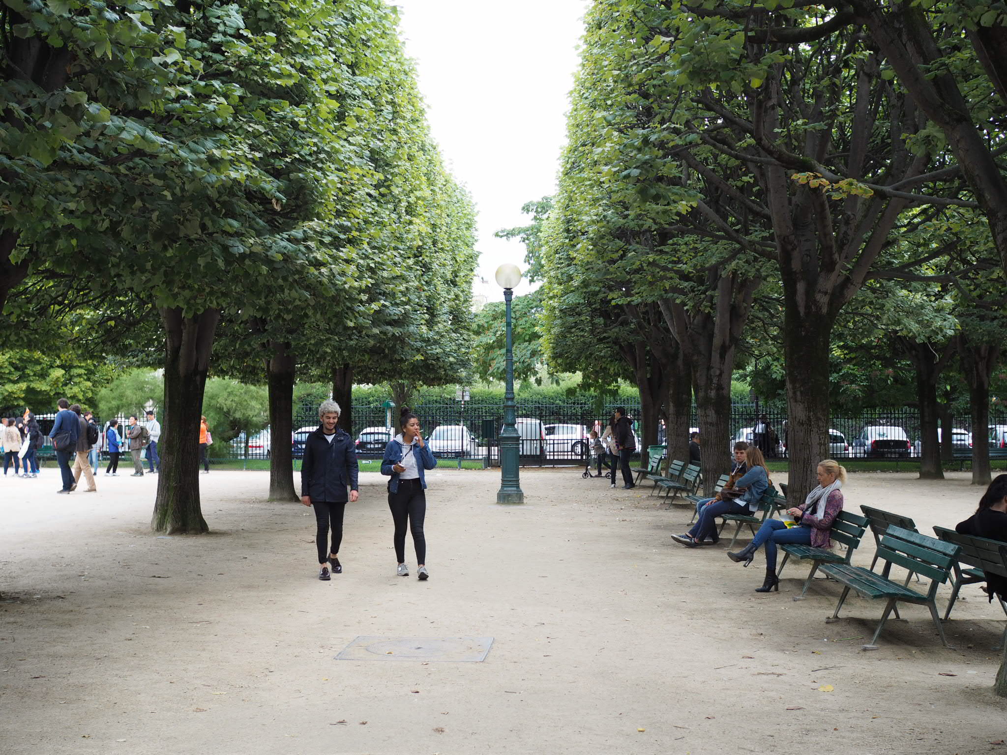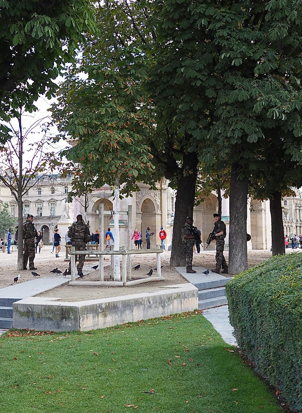 Tässä vaiheessa totesin nähneeni tarpeeksi ja menin museon ulkopuolella sijaitsevaan Jardin des Tuileriesin puistoon, jossa vierailee vuosittain noin 14 miljoonaa kävijää. Ostin puistossa olevasta Paul’n kojusta briepatongin ja maitokahvin, ja syödessäni seurasin, kuinka vanha nainen vieressäni ruokki lintuja. Käytävällä sotilaat kävelivät pareittain rynnäkkökiväärit olallaan. Kaikesta näkee, että Pariisin turvatoimia on lisätty terrori-iskujen jälkeen.