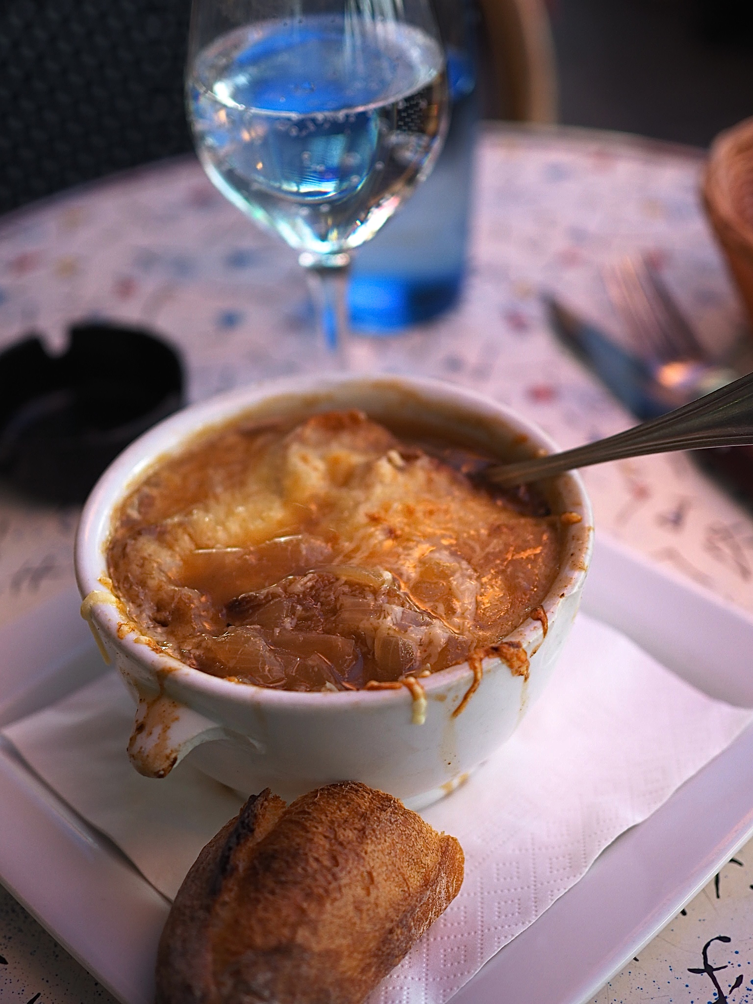 Pompidousta poikkesin lähellä olevan trattorian terassille nauttimaan perinteisen ranskalaisen sipulikeiton, joka oli todella hyvää! Lämmin keitto sopi muutenkin koleaan päivään. Lämpöasteet kieppuivat 15 asteen molemmin puolin ja välillä satoi hienoa tihkua. Aivan toisenlaiset kelit siis kuin Amsterdamissa!