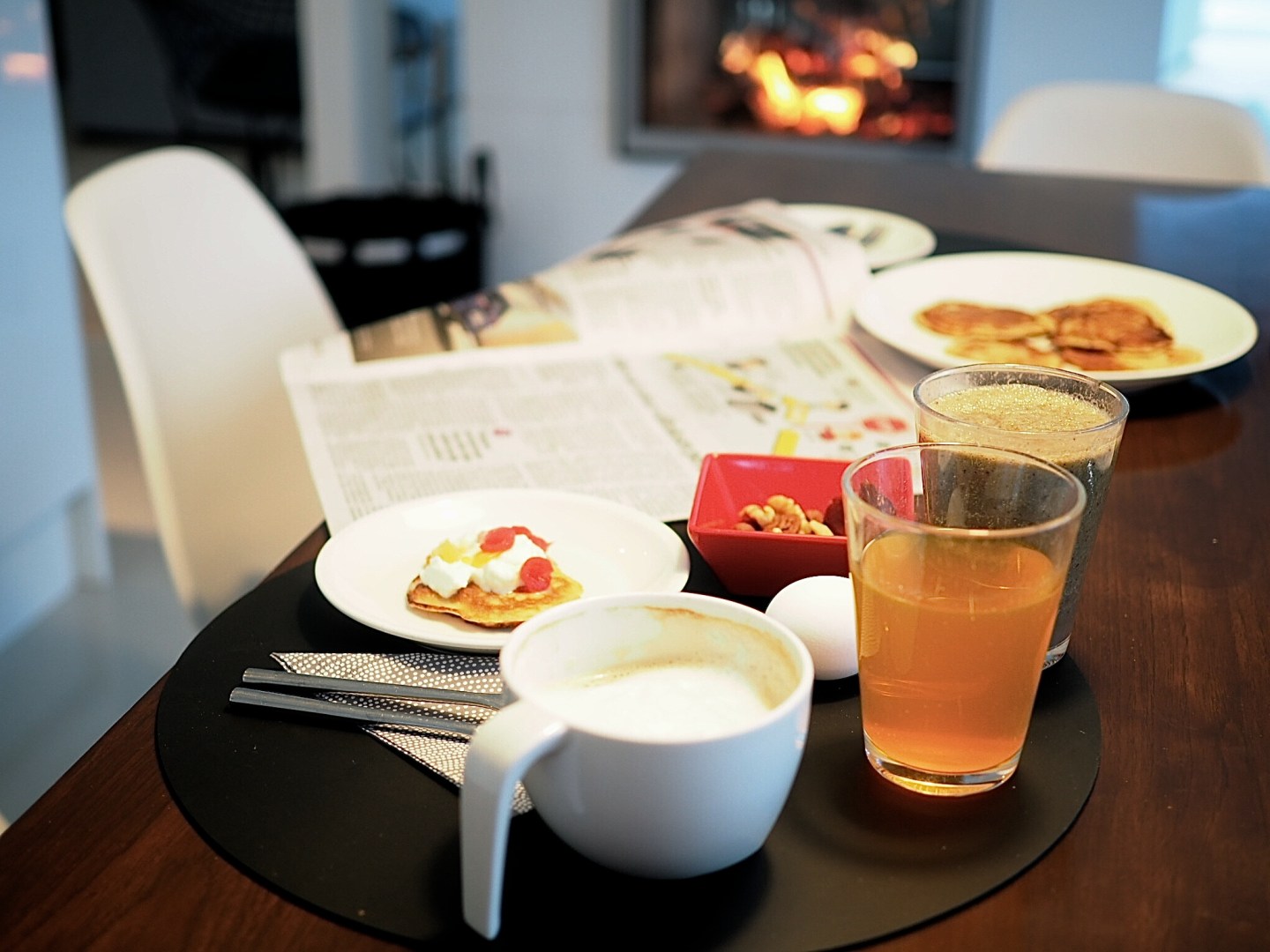 Olen siirtynyt viljattomaan ruokavalioon ja pyrin välttämään myös maitotuotteita, mutta sunnuntaiaamuun kuuluu ehdottomasti vaahdotettu maitokahvi. Lisäksi proteiiniletut, smoothie, kananmunia ja pähkinöitä. Näillä eväillä päivä lähtee mukavasti käyntiin. Sitten ei muuta kuin takkatuli ja päivän lehti, printtiversiona tottakai!
